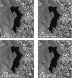 شکل 6-9 نمونه برداری مجدد از یک تصویر لندست TM: (الف) اصلی، (ب) نزدیکترین همسایه، (ج) درون یابی دو خطی و (د) کانولوشن مکعبی