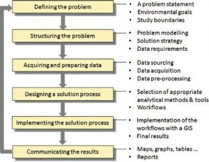 حل مشکل محیط زیستی با GIS تنها پس از ساختار صحیح و صریح امکان پذیر است. بسیار مهم است که با درک ساختار مشکل شروع کنیم تا عزم راسخ برای بکارگیری ابزارهای GIS و داده‌های مکانی در دسترس باشد. ساختاربندی مسئله فرآیندی است برای رسیدن به درک کافی از اجزای مشکل خاص که به انجام تحقیقات خاص اجازه می‌دهد. دو تکنیک اصلی ساختاربندی مساله وجود دارد که به طور گسترده در حل مسائل استفاده می‌شود: تجزیه و مدل سازی. رویکرد تجزیه‌ای به ساختار مسئله (اسمیت 1989) پیشنهاد می‌کند که مسئله پیچیده را  به چندین زیر مسئله تجزیه کرد که پیچیدگی کمتری دارند و  آنها را به طور جداگانه حل کرد (تفرقه بینداز و حکومت کن). پس از حصول نتایج هر مشکل فرعی، آنها در راه حل ادغام می‌شوند. با توجه به روشی برای تجزیه مشکلات به مجموعه‌های محدود از زیرمشکلات ساده، ساختار تجزیه ای شناسایی یک راه حل موفق را تسهیل می‌کند.