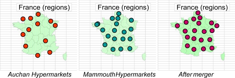 شکل 4.12. ادغام هایپر مارکت های Auchan و Mammouth (NB: در این الگوها، تنها حضور فروشگاه ها در مناطق با حلقه ها نشان داده می شود ؛ در سطح دپارتمان، این حضور حتی بیشتر قابل توجه است). برای نسخه رنگی از