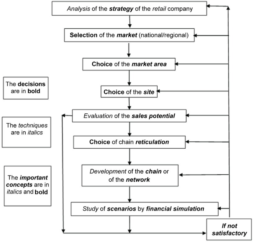 فرایند تصمیم گیری برای مکان یابی نقاط فروش را می توان در شکل 4.1 (Ghosh and McLafferty 1987 ؛ Cliquet 2008 ؛ Cliquet et al. 2018) توصیف کرد و با توجه به حلقه بازخورد اصلاح شد.