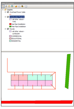ظاهراً چند بازدید در منطقه وجود دارد. اگر از ابزار Identify استفاده کنید، در یک طرف منطقهی قطعی، گروه خواندن کنتورها را میبینید و احتمالاً این گروه دلیل قطعی نیستند. از آنجایی که به پروژهی دادهها دسترسی داریم، سرویس نقشهای Constructions_Scenario_2 را میتوانیم اضافه کنیم.