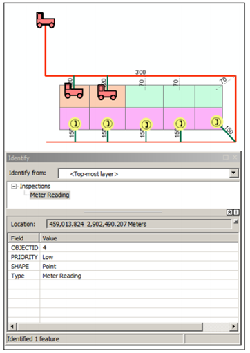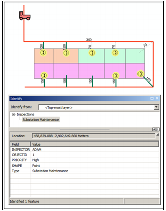 از آنجائی که هیچ پروژهای در نزدیکی شبکهی برق نیست، بهتر است بازدیدهای اخیری که در سرویس نقشهای Inspections قرار دارد را بررسی کنیم. این سرویس را به نقشه اضافه کنید. همانطور که در تصویر زیر میبینید یک بازدید در حال انجام است. ابزار Identify را انتخاب و روی این بازدید کلیک کنید. یک واحد پشتیبانی پیدا خواهید کرد که شاید دلیل قطعیها باشد.