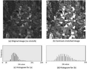کشش کنتراست شامل تنظیم توزیع و محدوده مقادیر DN است. توزیع مقادیر DN که شامل تصویر است معمولاً به صورت گرافیکی با استفاده از هیستوگرام نشان داده میشود، همانطور که در شکلهای 6-13 c و 6-13 d نشان داده شده است. در یک هیستوگرام تصویر، مقادیر DN در امتداد محور x نمودار نمایش داده میشود، در حالی که تعداد پیکسلهای تصویر در هر مقدار DN مختلف در محور y نشان داده میشود. توزیع مقادیر DN در هیستوگرام تصاویر سنجش از راه دور اغلب یک وجهی است (با یک پیک واضح). هر دو شکل 6-13 c و 6-13 d دارای توزیع بدون تغییر هستند. توزیعهای چند حالته (با دو یا چند پیک واضح) در صورتی حاصل میشود که صحنه شامل دو یا چند طبقه غالب با محدوده بازتاب متفاوت باشد.