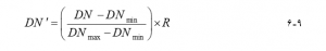 که در آن DN مقدار کشیده شده به پیکسل در تصویر خروجی است، DN مقدار اصلی پیکسل در تصویر ورودی است، DNmin و DNmax به ترتیب حداقل و حداکثر مقادیر پیکسل در تصویر ورودی و DN محدوده DN هستند مقادیری که میتواند در دستگاه خروجی نمایش داده شود (به عنوان مثال ، 255). در مثال نشان داده شده در شکل 6-13، R برابر با 255، DNmin برابر با 18 و DNmax برابر با 191 است. هر پیکسل با مقدار DN برابر با 18 در شکل 6-13 a، پس از اعمال معادله 6-9، مقدار DN برابر با صفر خواهد داشت، در حالی که هر پیکسل با مقدار DN برابر با 191 است. در شکل 6-13 a اکنون دارای مقدار DN برابر با 255 خواهد بود. تمام مقادیر پیکسل بین 18 و 191 در تصویر اصلی به تناسب بین صفر و 255 کشیده میشوند. این روش معمولاً کشش حداقل کنتراست نامیده میشود.