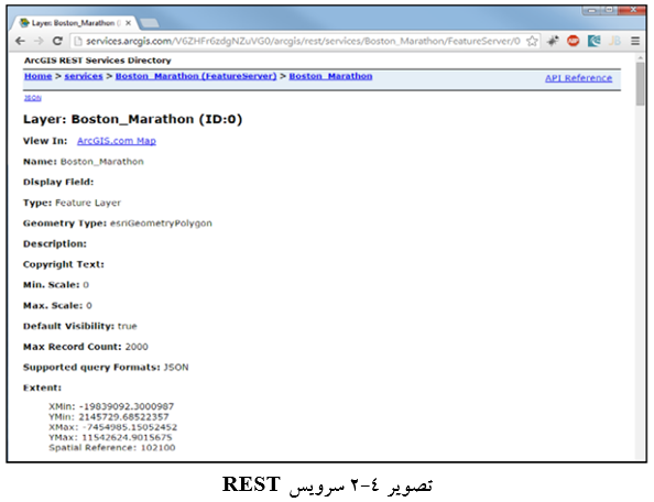 وقتی وارد لینک شدید در پنجره ظاهر شده همه اطلاعات مربوط به سرویس REST را میبینید. این اطلاعات شامل نوع لایه، نام فیلدها، شماره لایه و … است. هر لایه یک شماره یا ID منحصر به فرد دارد که با صفر شروع میشود.