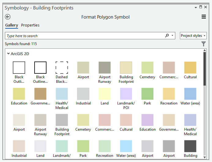 10. در کادر جستجو واقع در بالای بالای صفحه Symbology، تایپ کنیدردپای ساختمانبرای گالری فقط به نماد شناسی مرتبط با ساختمان فیلتر کنیدرد پا
